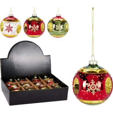 כדור זכוכית אדום עם זהב עם נצנצים ופתית שלג 8 ס"מ