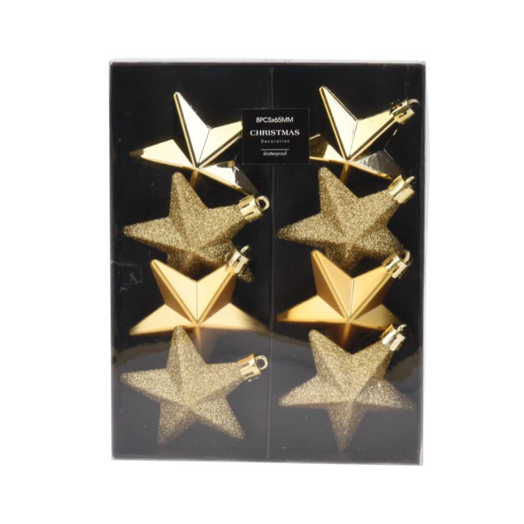 סט כולל: 8 קישוטים בצורת כוכב ב-3 גימורים (2 מט/4 מבריק/ 2 נוצץ)