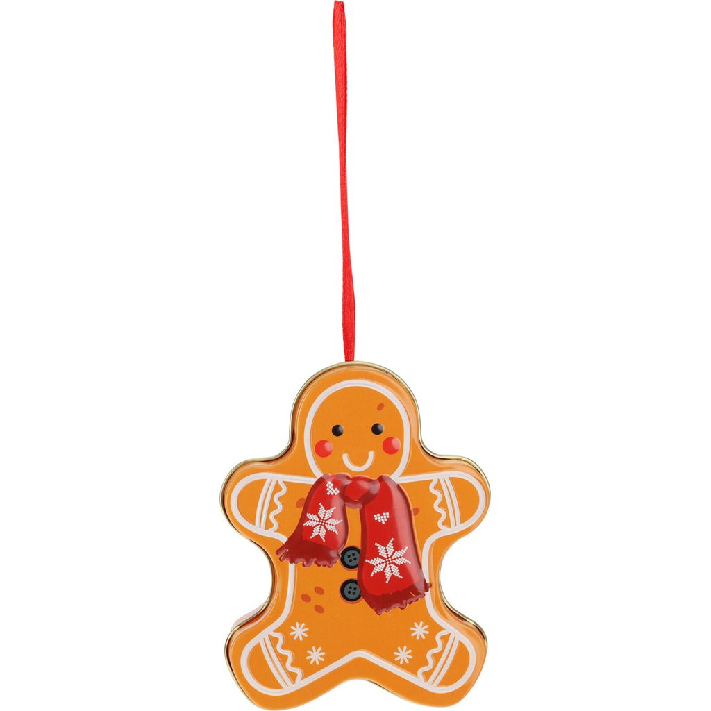 קישוט עץ חג המולד של איש זנגביל מקסים עשוי מתכת. הצבע הכתום התוסס והעיצוב המפורט עם צעיף אדום ופתיתי שלג יוצרים מצב רוח חגיגי. הקישוט מגיע עם סרט אדום לתלייה על העץ.