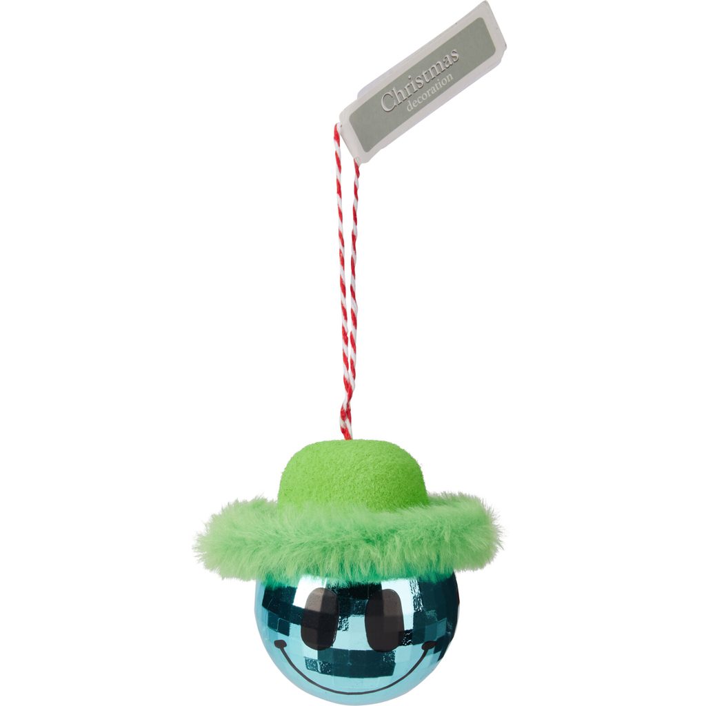 תכשיט עץ חג המולד הזה יוסיף נופך של צבע מהנה ובהיר לעץ שלך. מעוצב בצורת פרצוף סמיילי מצחיק עם כובע פרווה ירוק, זה עושה קישוט ייחודי.