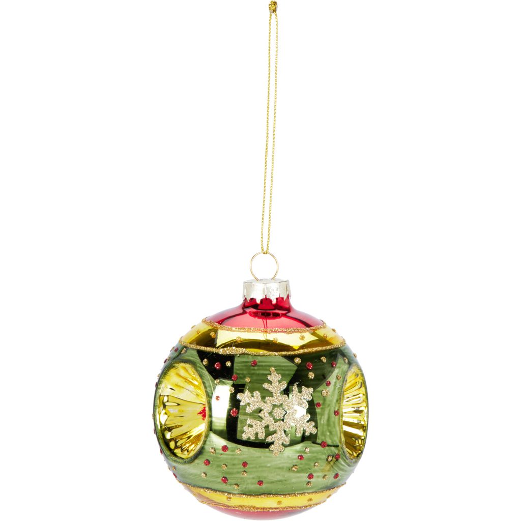 כדור הזכוכית המעולה הזה יהיה תוספת נפלאה לעץ חג המולד שלך. שילוב של אדום עשיר, ירוק עמוק וזהב בוהק. הכדור מעוטר בפתית שלג זהוב אלגנטי ובעל חלונות דקורטיביים במילוי מוזהב.