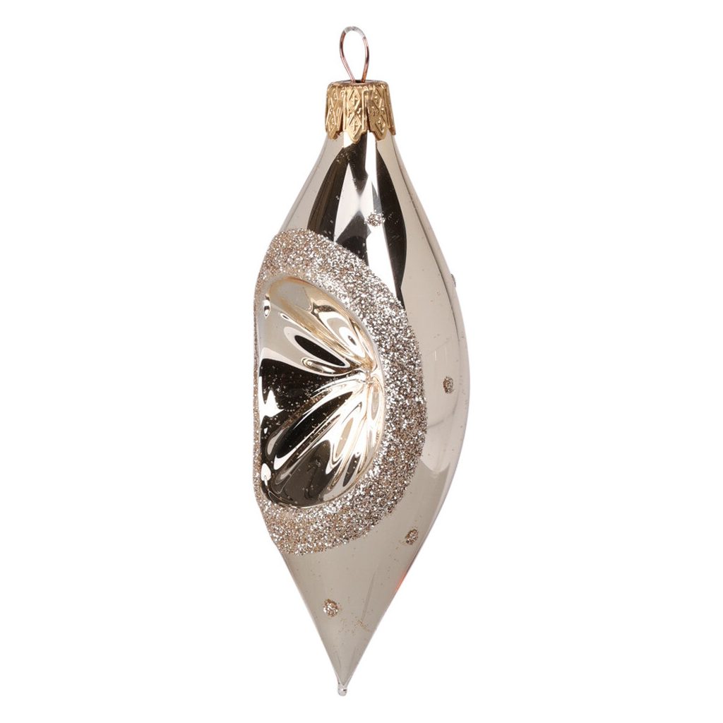 קישוט עץ חג המולד בצורת נטיפי קרח ובתוכו משקף מוזהב מרהיב. הכדור עשוי בעבודת יד, מה שהופך כל מוצר לייחודי.