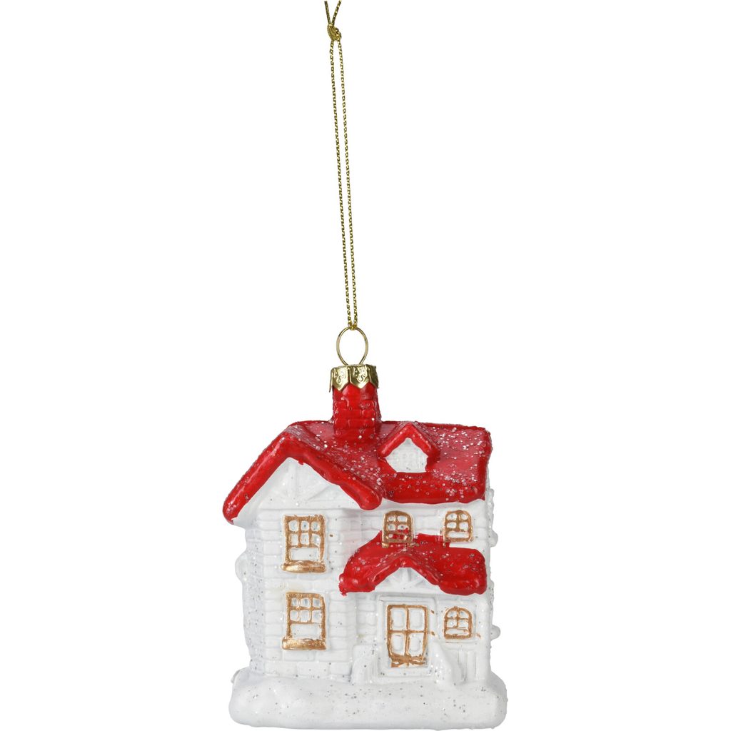 קישוט עץ חג המולד המקסים הזה בצורת בית יהווה תוספת נפלאה לעיצוב החג שלך. עשוי זכוכית ומעוטר בזיגוג אדום ונצנצים מנצנצים, יוסיף אווירה נעימה וחגיגית.