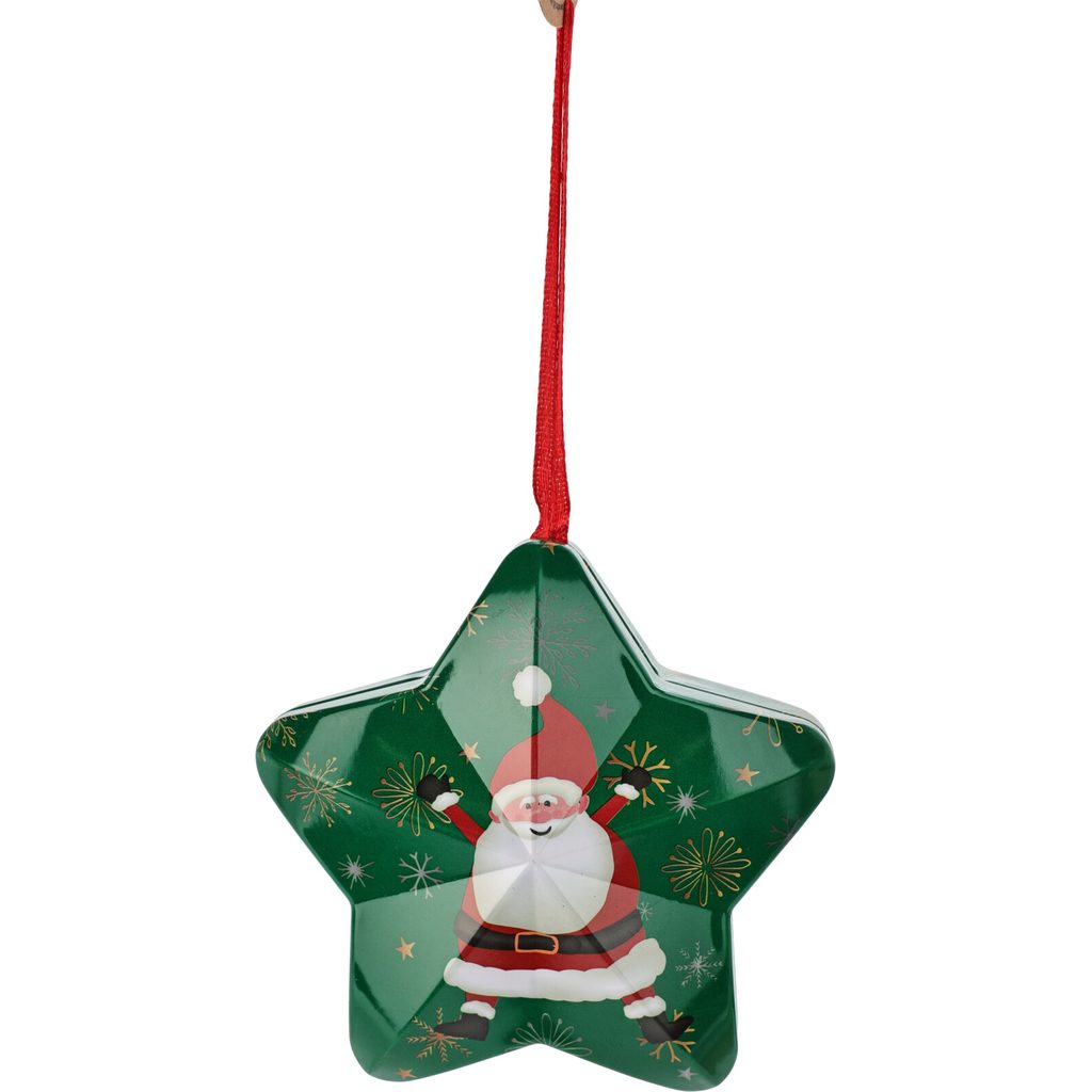קישוט עץ חג המולד: כוכב מתכת (קופסה), ירוק עם תמונה של סנטה קלאוס ופתיתי שלג, 10 ס”מ