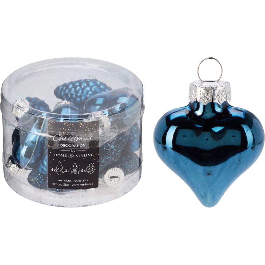 הסט כולל 12 עיטורי זכוכית בגימור מבריק, מט ומבריק. הקישוטים מוצגים בצורת לבבות, קונוסים וכוכבים, מה שמקנה להם מראה מעולה. הם אידיאליים ליצירת אווירה חגיגית בביתכם.