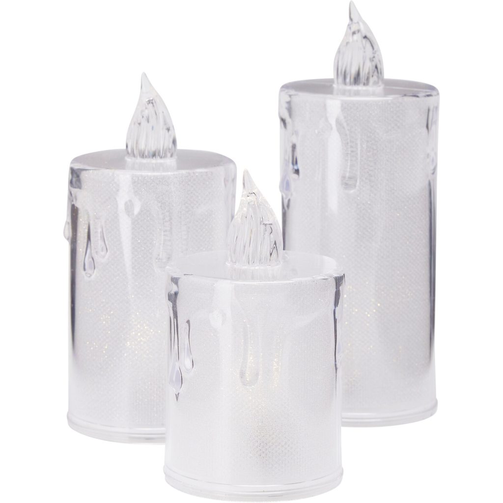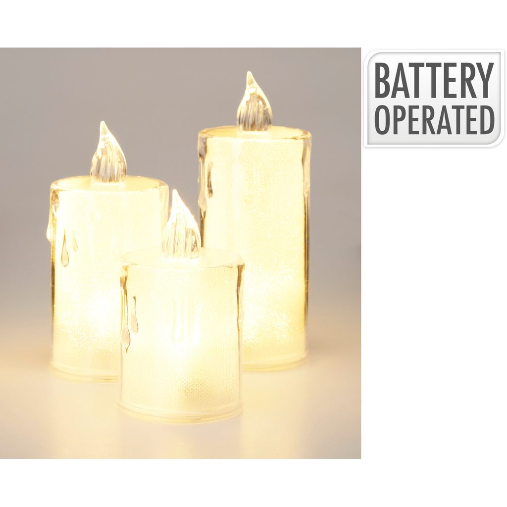 סט 3 נרות LED שקופים, אור חם, 8 – 12.5 ס”מ.