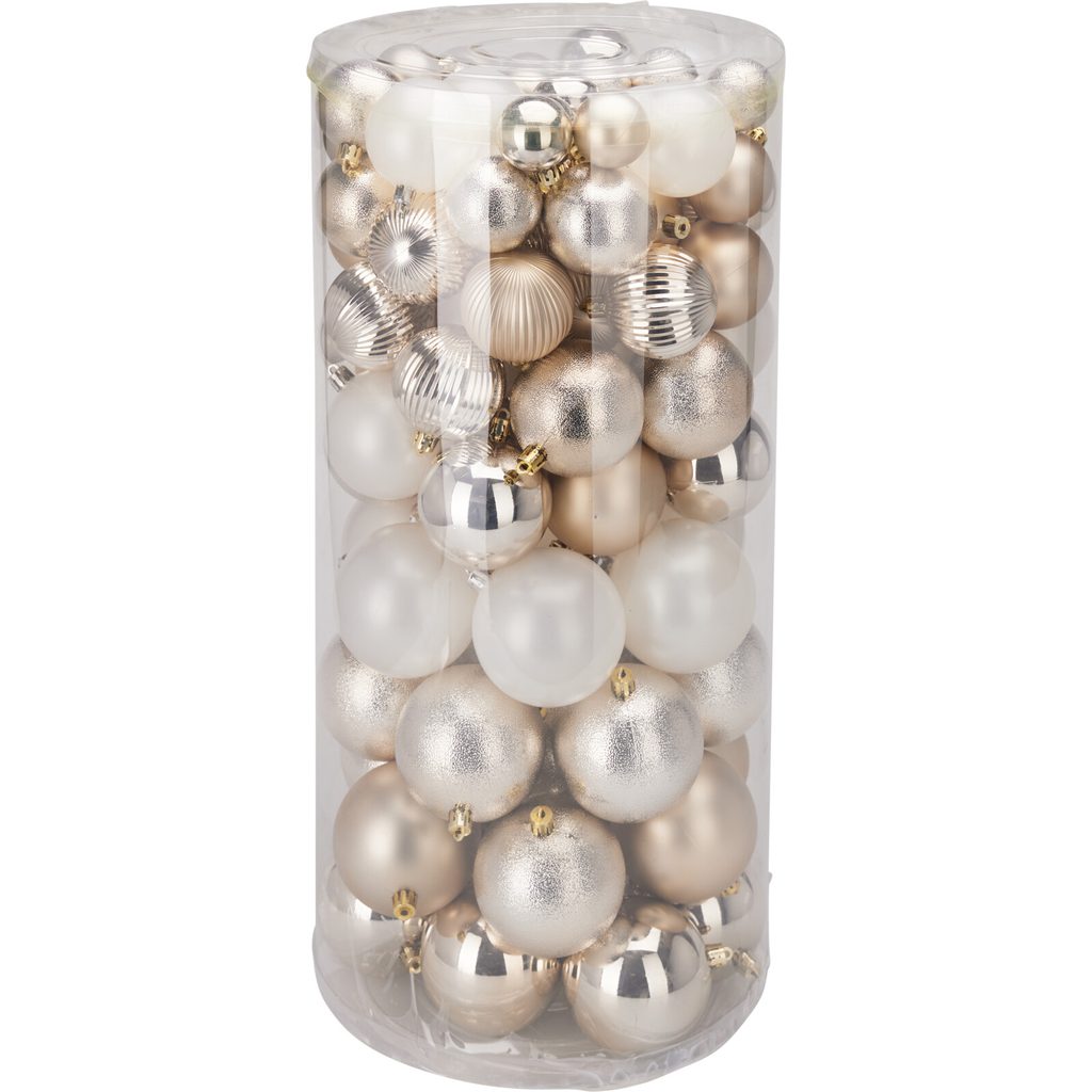 סט כדורי עץ חג המולד מפלסטיק, שמנת, 100 יח’, 4-8 ס”מ