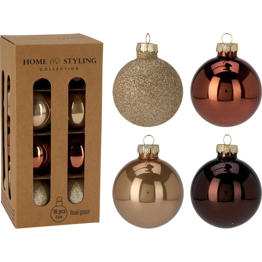 סט כדורי זכוכית לחג המולד, 16 יחידות, חום, 6 ס”מ