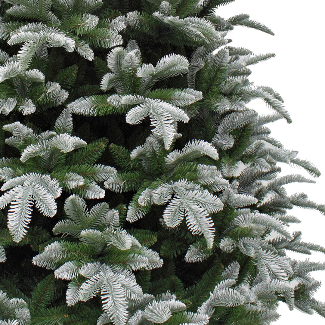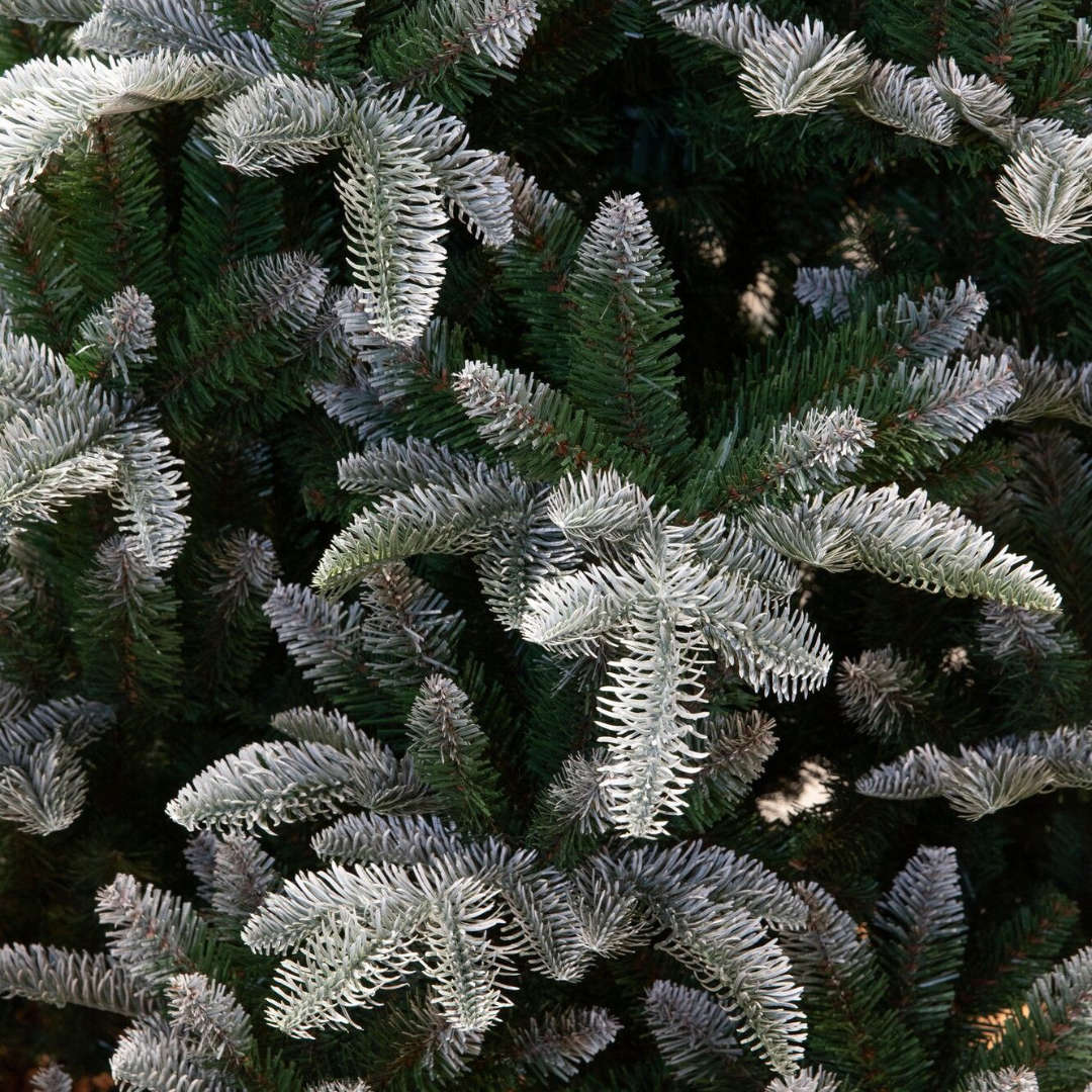 Белые кончики веток словно покрыты искусственным снегом, создавая лёгкий эффект заснеженности. Боковые хвойные лапки выходят за контуры дерева, что визуально делает его более объёмным. Белоснежный декор гармонично сочетается с натуральным зелёным оттенком хвои, придавая дереву сказочный вид. В сочетании с гирляндами или свечами эта елка станет ярким украшением вашего дома на праздники.