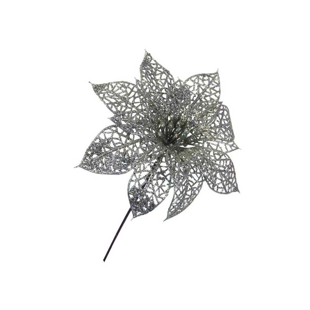 Декоративный цветок серебряного цвета в блёстках на тонком стебле