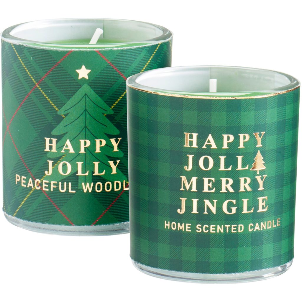 Этот набор из четырех ароматических свечей в стеклянных стаканах станет прекрасным дополнением к вашему праздничному декору. Каждая свеча оформлена в зеленой цветовой гамме с классическим клетчатым узором и изображением елки, а также украшена золотистой надписью «Happy Jolly Merry Jingle». Свечи создадут уютную и праздничную атмосферу в вашем доме.