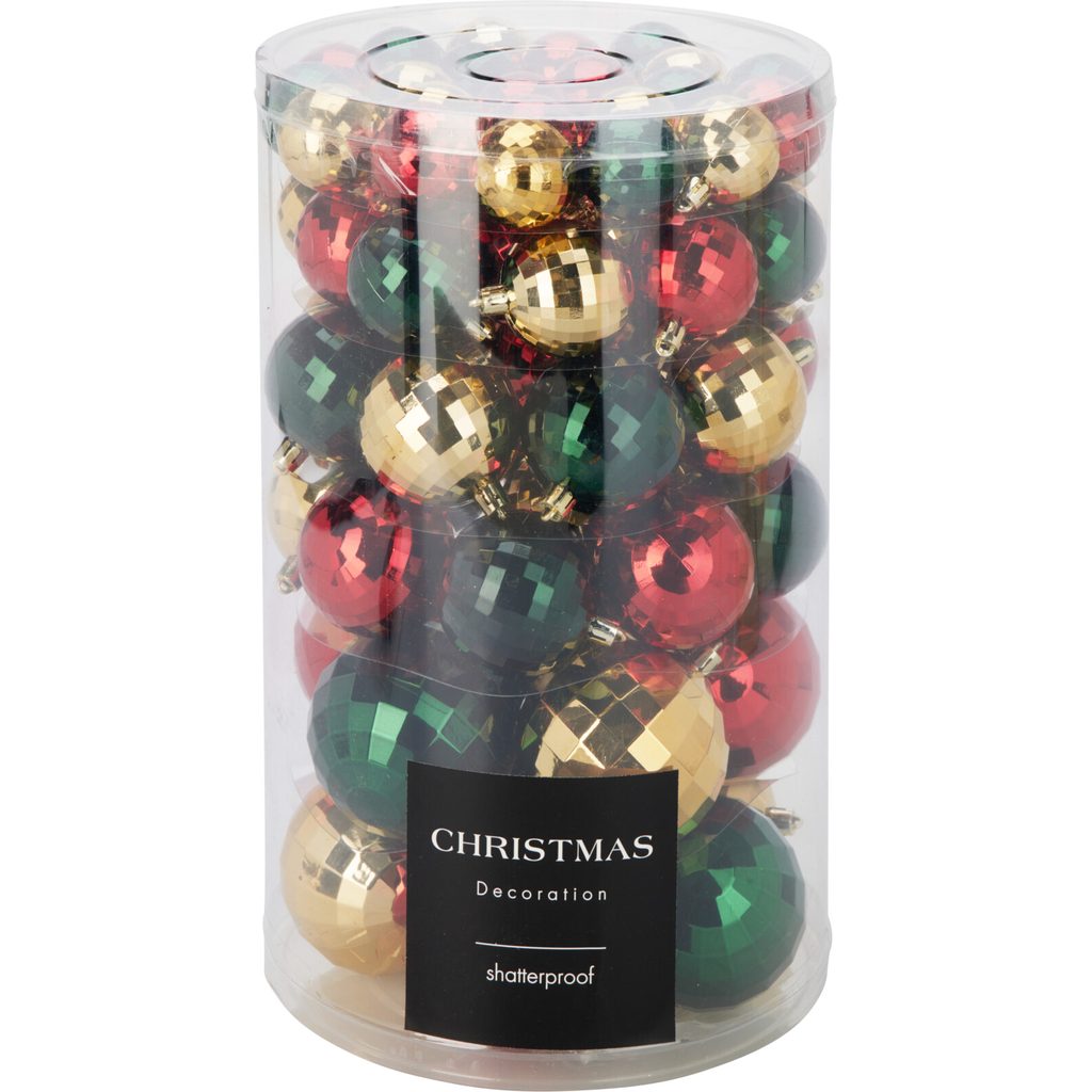 Этот набор ёлочных украшений включает 64 зеркальных шара в традиционных рождественских цветах: красном, золотом и зелёном. Шары имеют разнообразные размеры, что позволяет создать интересную композицию на вашей ёлке.