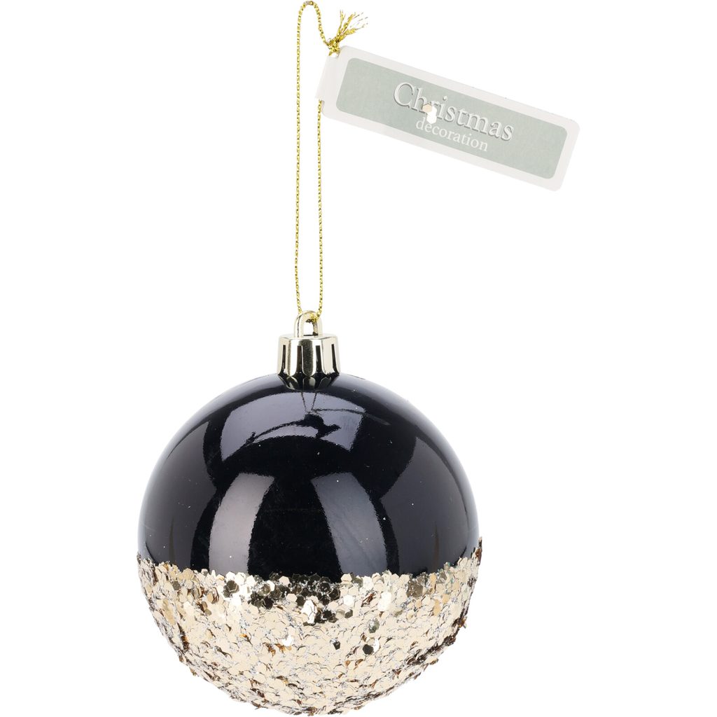 Этот ёлочный шар станет изысканным дополнением к вашему новогоднему декору. Верхняя часть шара выполнена в глянцевом чёрном цвете, а нижняя украшена крупными золотыми блёстками, создавая праздничное настроение. Шар идеально подходит для украшения ёлки, создания композиций или в качестве подарка.