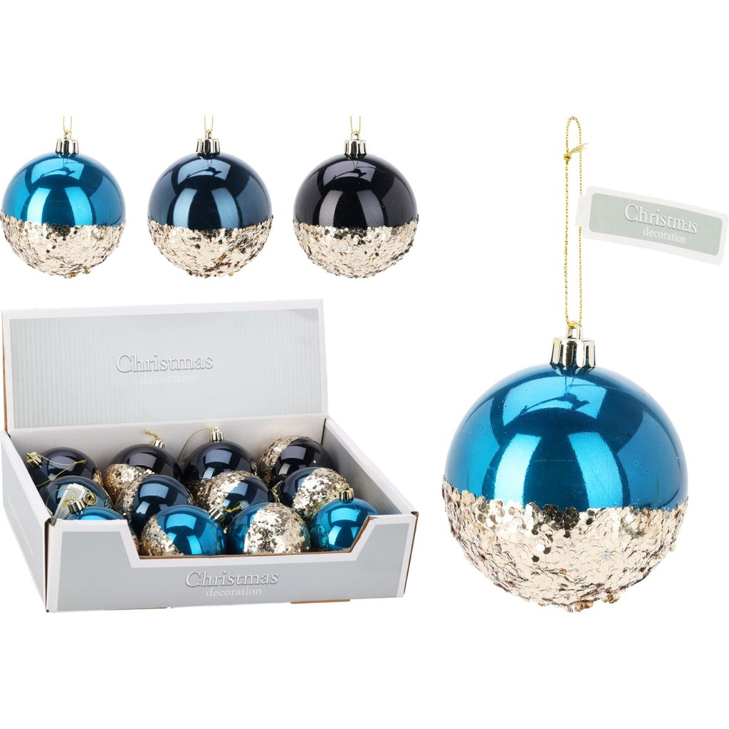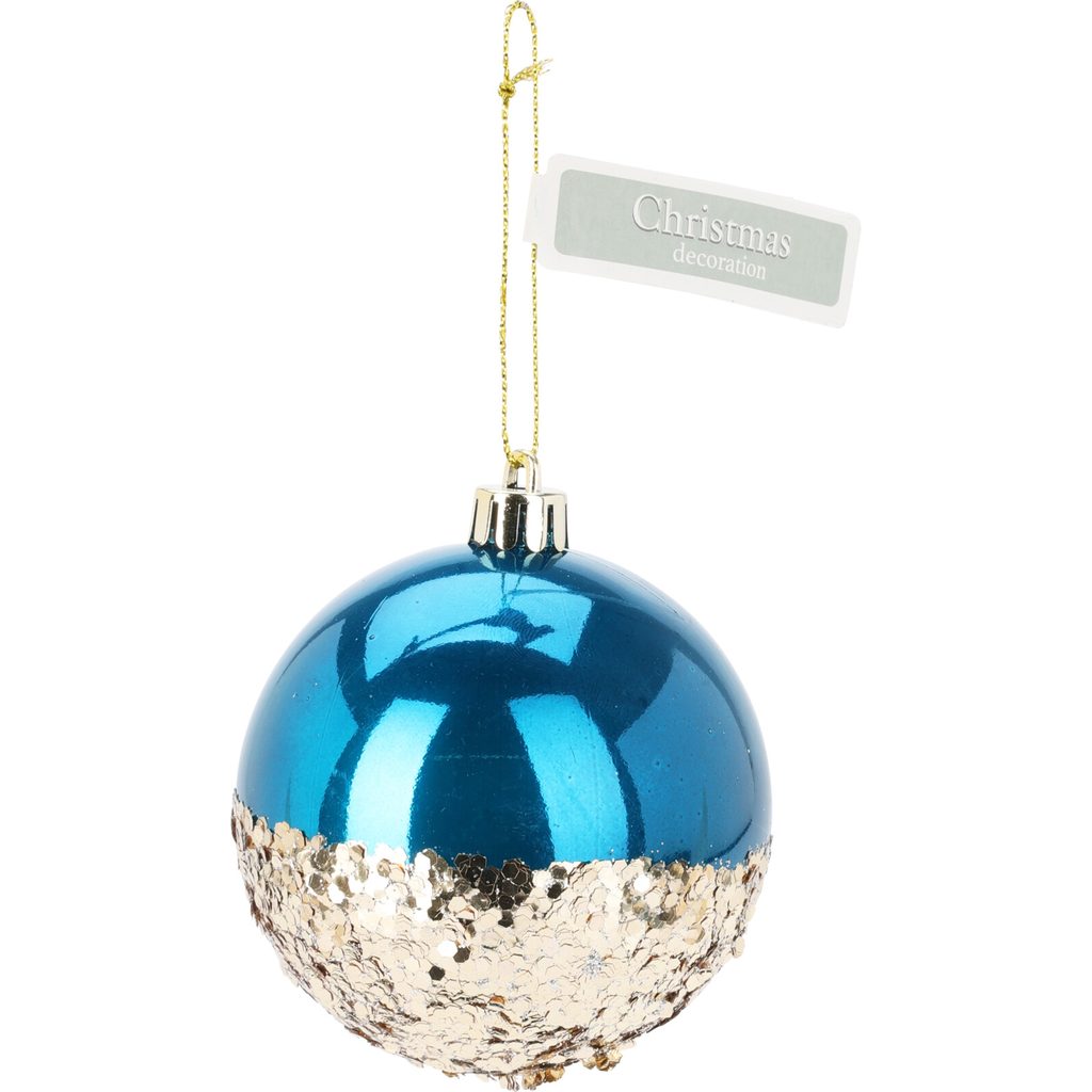 Этот ёлочный шар станет ярким акцентом вашего праздничного декора. Верхняя часть шара выполнена в насыщенном голубом цвете с глянцевым блеском, а нижняя украшена крупными блёстками, создающими праздничное настроение. Шар легко подвешивается на ёлку благодаря золотистой нити.