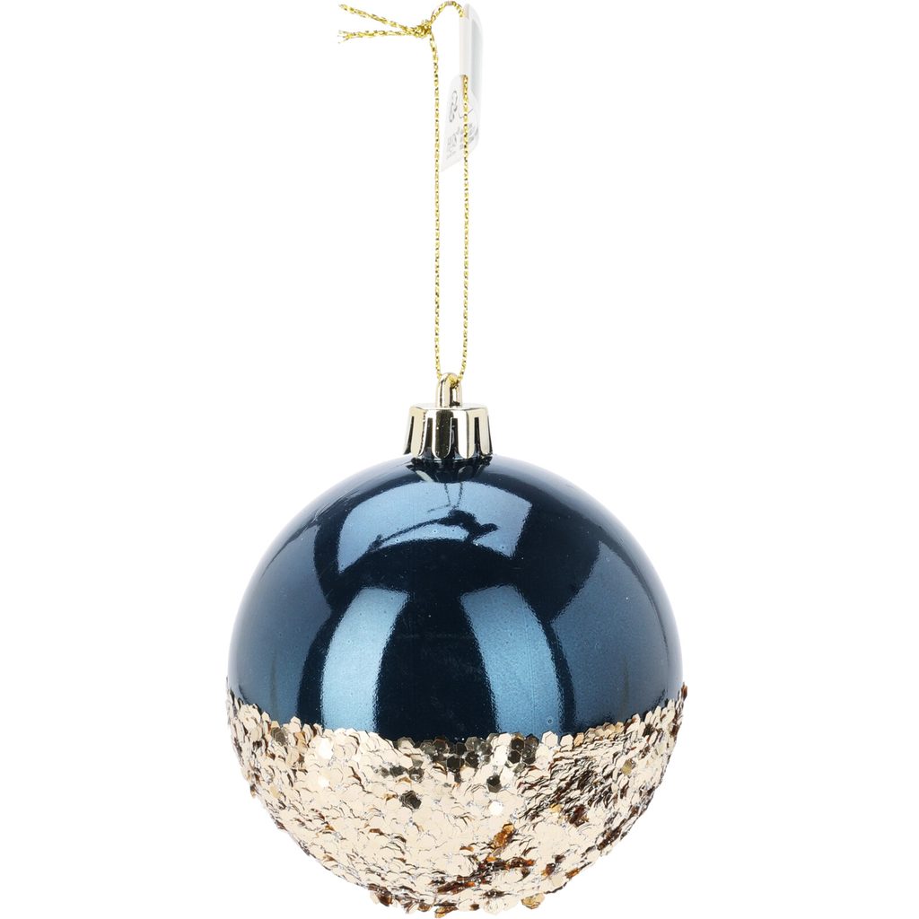 Этот ёлочный шар станет ярким акцентом в вашем новогоднем декоре. Сочетание глубокого синего цвета и мерцающих блёсток создаёт праздничное настроение.