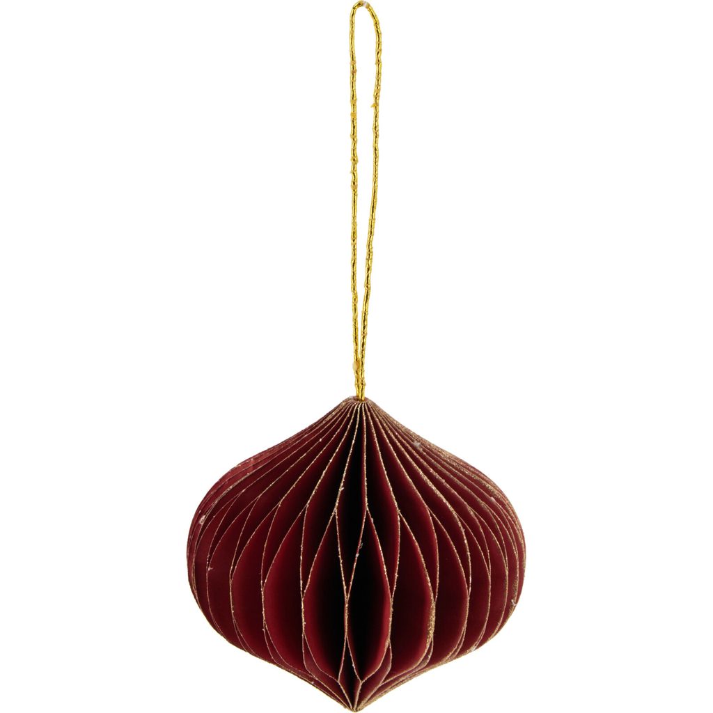 Это элегантное ёлочное украшение в форме луковицы выполнено из бумаги и украшено золотыми блёстками по краям. Его оригинальная форма и мерцающий декор создадут праздничную атмосферу. Экологически чистый материал.