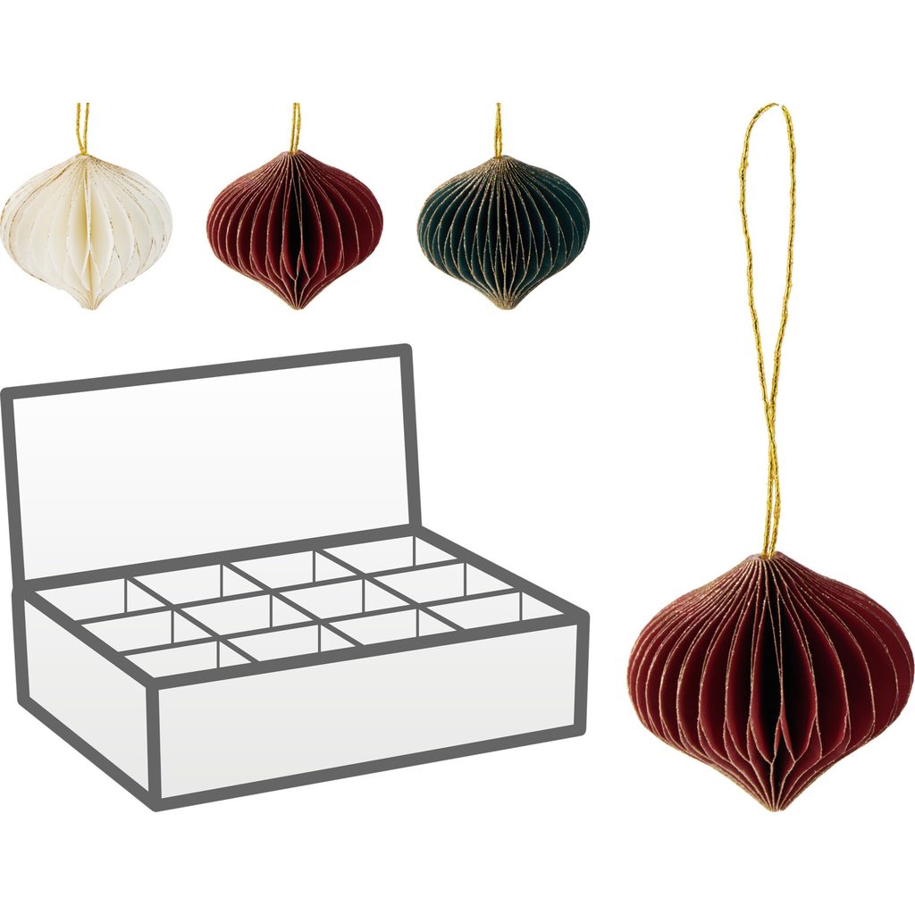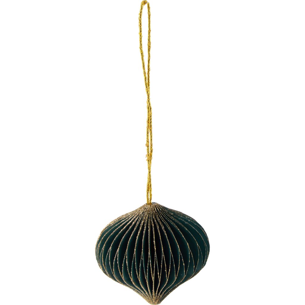 Это элегантное ёлочное украшение в форме луковицы выполнено из бумаги и украшено золотыми блёстками. Его уникальная структура и насыщенный зелёный цвет с мерцающими акцентами придают праздничной ели изысканный вид. Украшение легко подвешивается благодаря золотистой нити. Экологически чистый материал