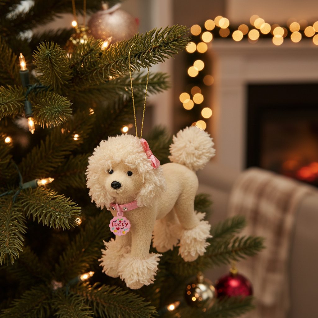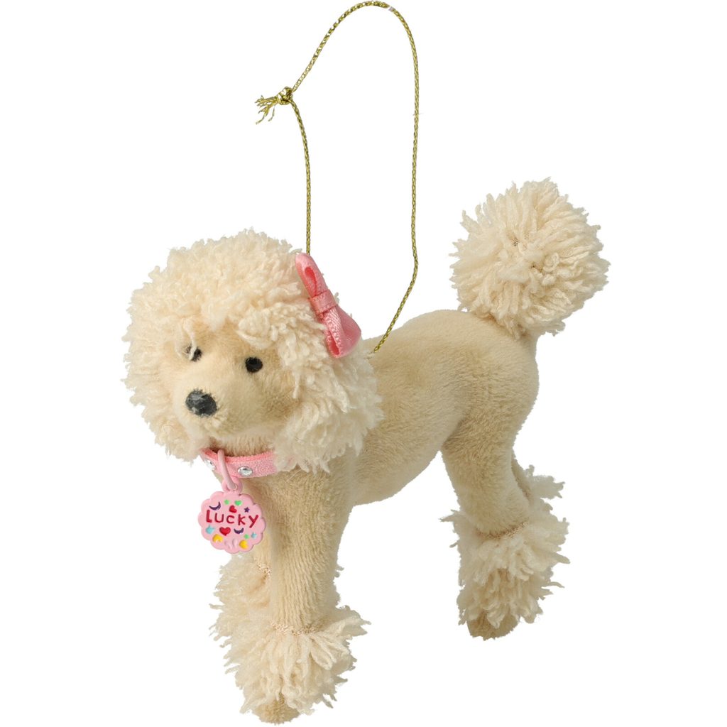 Очаровательное ёлочное украшение в виде плюшевого пуделя кремового цвета, одетого в розовый бантик и ошейник с подвеской “Lucky”. Игрушка выполнена из мягкого плюша, имитирующего шерсть, с помпонами на ушах, хвосте и лапах, что придает ей реалистичный и милый вид.