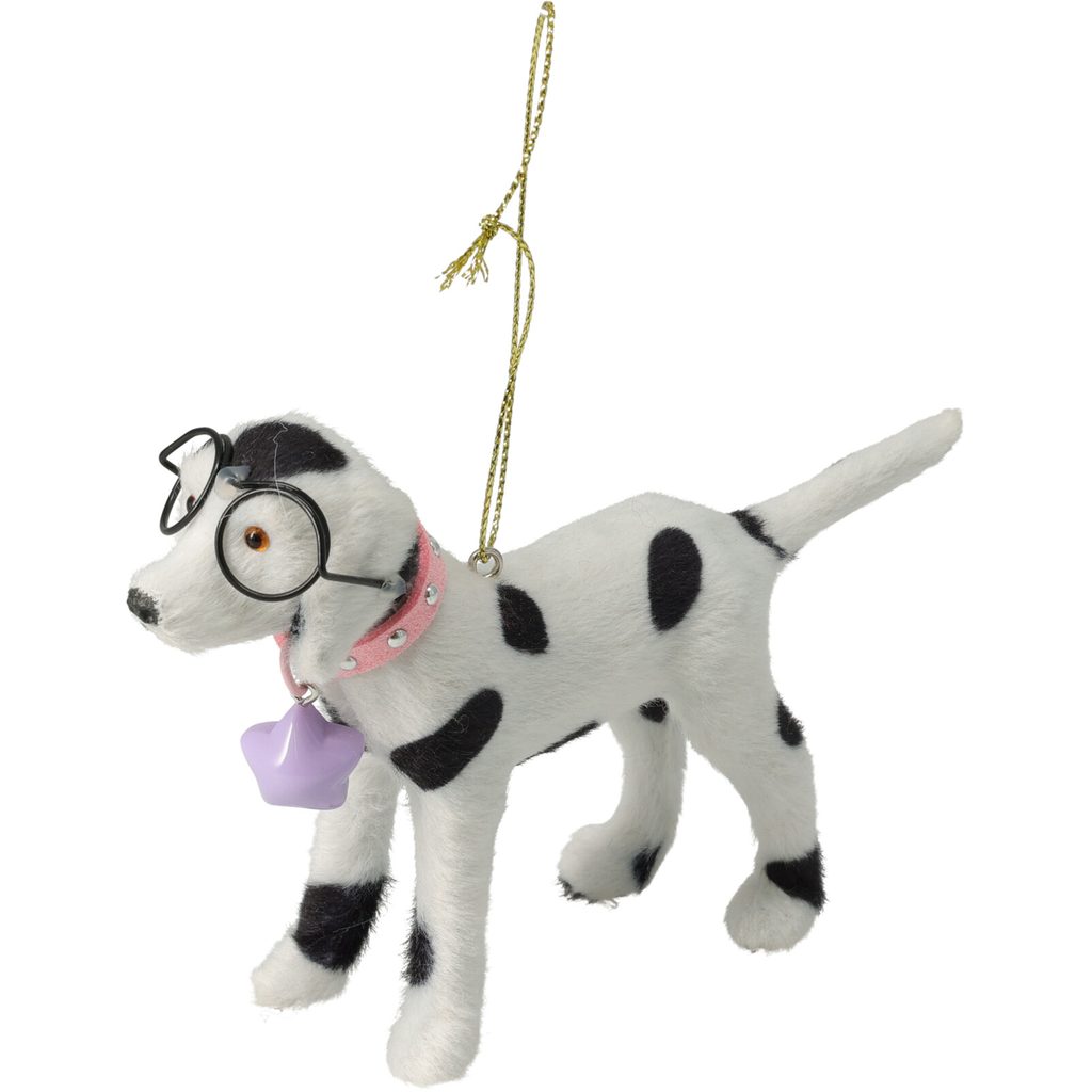 Это очаровательное ёлочное украшение в виде собаки породы далматин станет прекрасным дополнением к вашему новогоднему декору. Фигурка выполнена из приятного на ощупь текстиля с характерными чёрными пятнами, что придаёт ей реалистичный вид. Собачка одета в розовый ошейник с блёстками и украшена милым сиреневым кулоном в форме звезды, а также стильными очками.