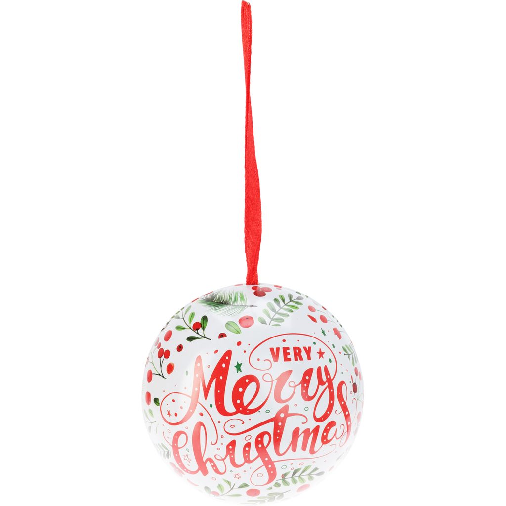 Этот ёлочный шар станет прекрасным дополнением к вашему новогоднему декору. Изготовленный из прочного металла, он украшен яркой росписью с новогодними мотивами и надписью “Very Merry Christmas”. Шар оснащён красной лентой для удобного подвешивания на ёлку.