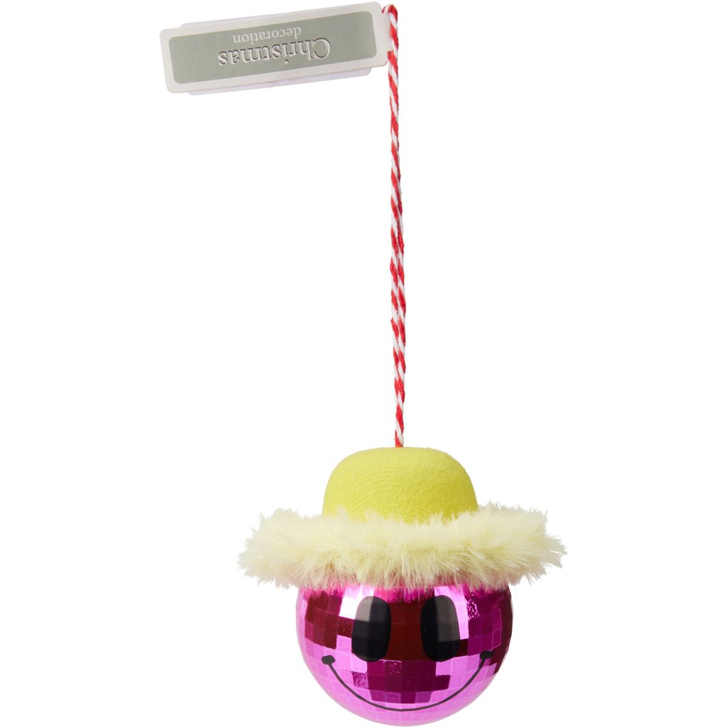 Этот очаровательный ёлочный шар в виде смайлика с модной шляпкой станет ярким акцентом на вашей новогодней елке. Зеркальная розовая поверхность придает ему праздничный блеск, а мягкая меховая отделка и стильная шляпка добавляют игривости. Шар прекрасно подойдет для создания веселой и уютной атмосферы в доме.