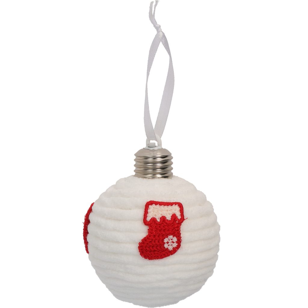 Этот ёлочный шар в форме лампочки станет очаровательным дополнением к вашему новогоднему декору. Белый текстильный материал с рельефной фактурой и вышитым красным рождественским носочком с снежинкой создают уютную атмосферу праздника. Встроенная тёплая белая LED-подсветка, работающая от батареек, придаёт украшению особое мерцание.